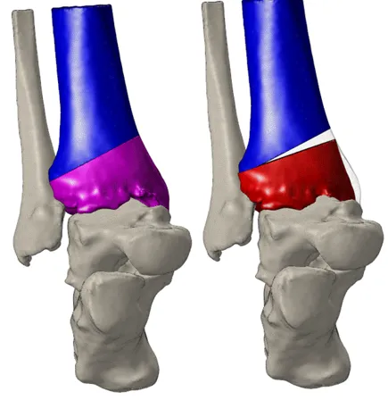 The simulation predicted that using a 14 mm saw with 0.4 mm thickness to create a wedge opening (of 8.72° and 5 mm wide), 20 mm from the tibial plafond to a depth of 31 mm, would result in an increase in the MDTA of 9.0° and a reduction of TLSA of 2.8°.